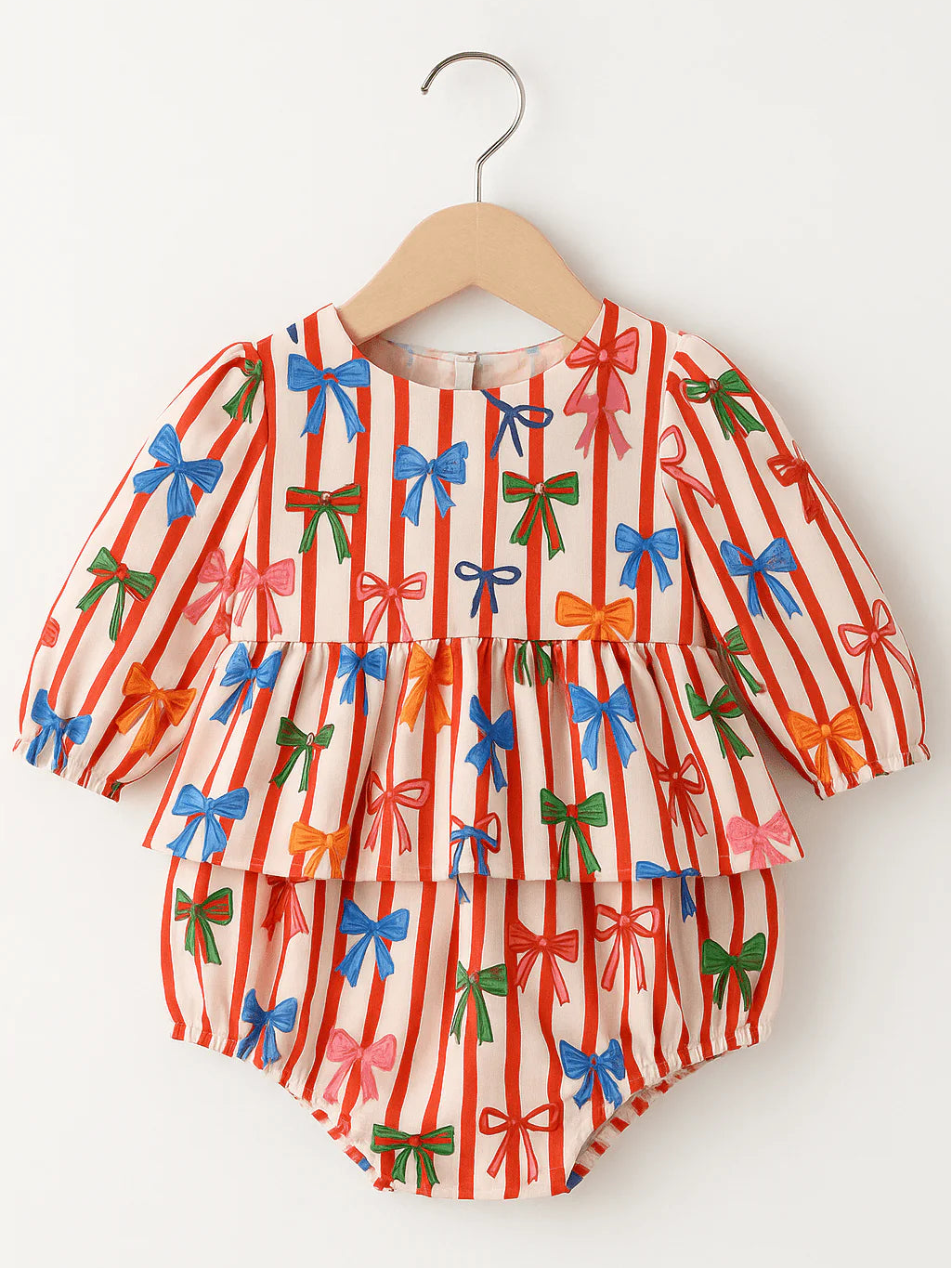 Sweet as can be! Our Bow Stripe Bubble is a cheerful holiday favorite, featuring hand-painted bows and candy-stripe red detailing. The double-tiered ruffle adds a playful touch, while the long sleeves and gathered cuffs keep your little one cozy and comfortable. Perfect for family photos, parties, or everyday twirls — it’s a piece that captures the joy of the season.