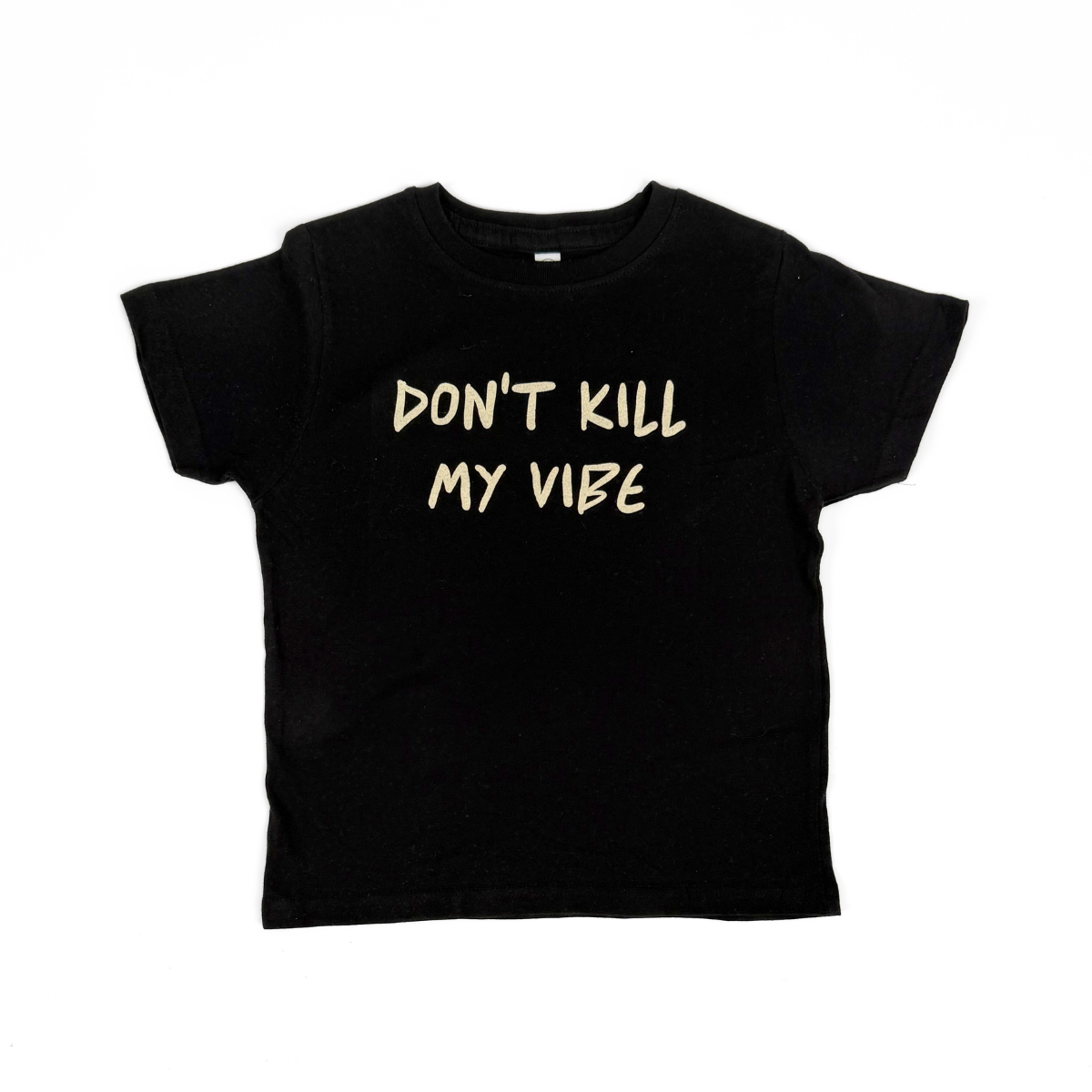 Let your little one's personality shine with this playful toddler tee featuring the cheeky "Don't Kill My Vibe" graphic. Crafted from soft, comfortable fabric perfect for active kids, this black tee pairs effortlessly with any outfit in their wardrobe. Whether they're expressing their mood or just looking adorable, this tee delivers both style and comfort.