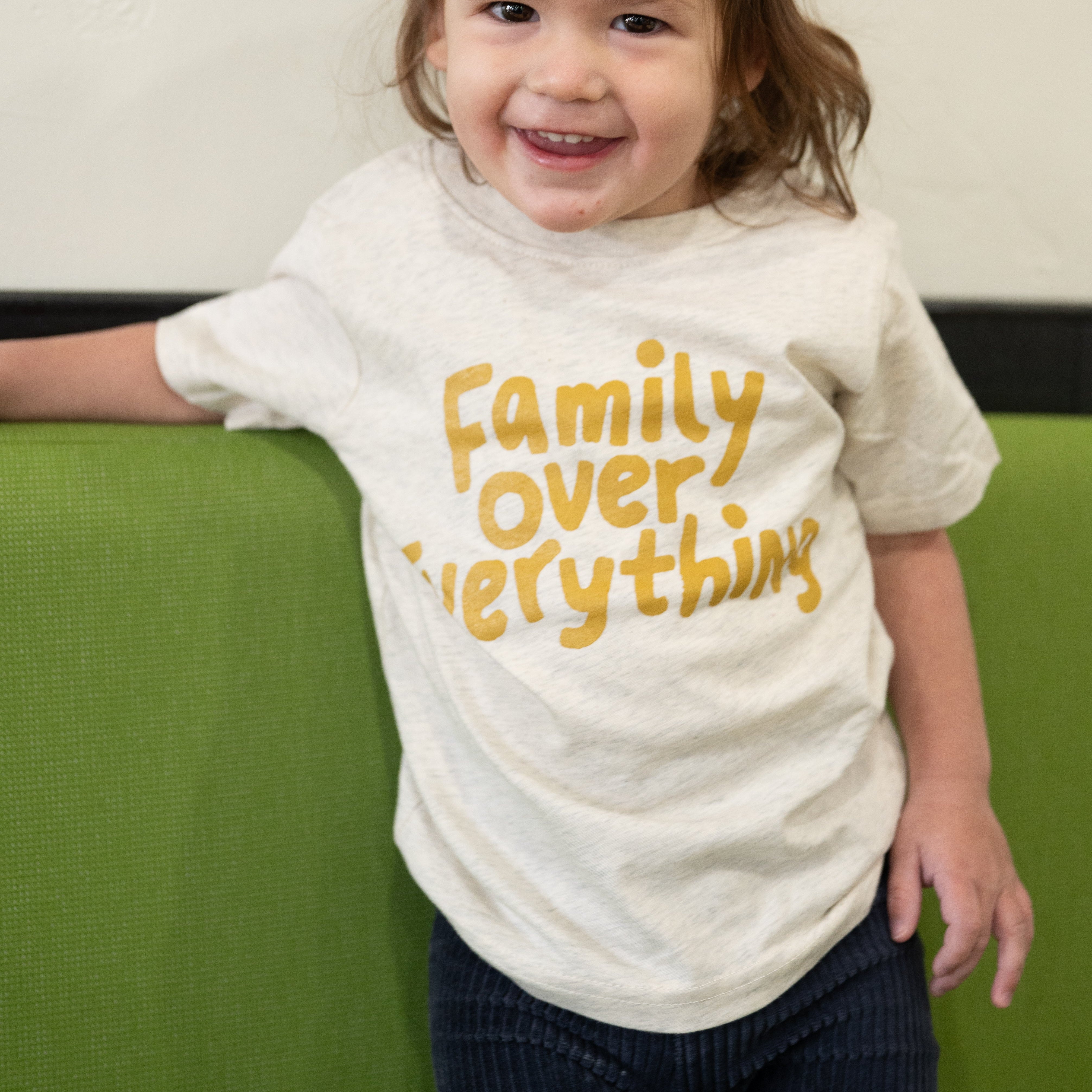 his heather grey toddler tee proudly declares “Family Over Everything” with a bold, playful graphic. Made from soft, breathable cotton, it’s comfy enough for playdates, park adventures, and plenty of family snuggles.