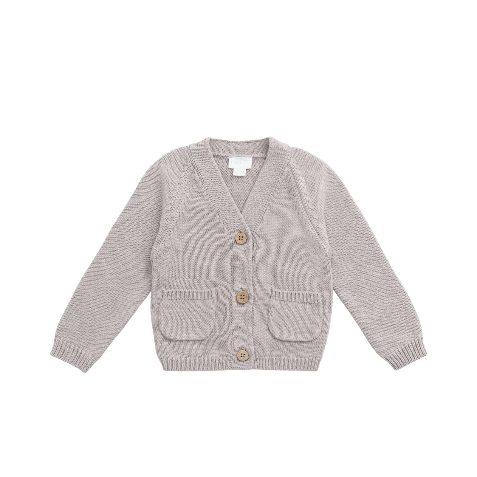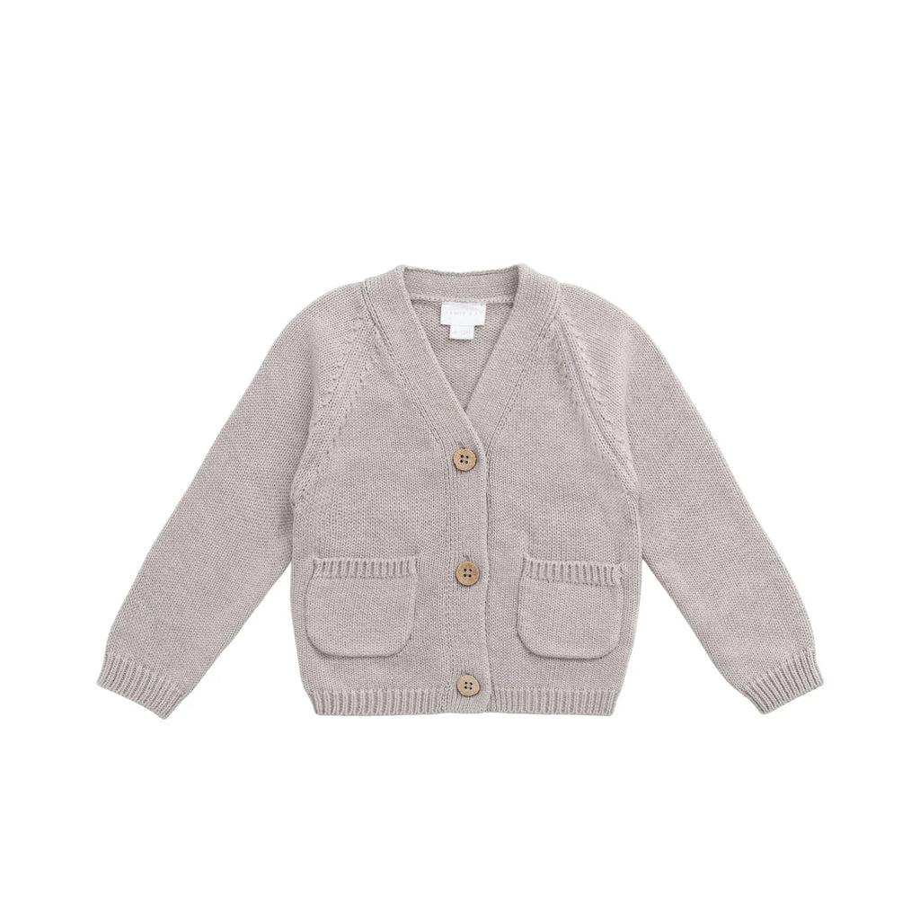 The Franco Cardigan in Moleskin Marle is a beautifully soft and breathable knit, perfect for layering on cooler days. Crafted in a light grey marled cotton, this cardigan features a classic V-neckline, three coconut buttons down the front, and two sweet pockets—ideal for tiny treasures or chilly hands.