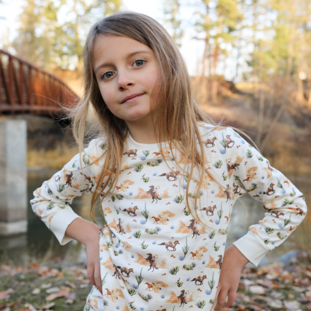 Crafted from a soft blend of 70% bamboo and 30% organic cotton, these 2 Piece Farm Animal PJ's offer exceptional comfort and breathability. The custom farm print adds a charming touch, making them perfect for cozy nights. This sustainable fabric combination ensures durability while being gentle on sensitive skin, ideal for restful sleep.