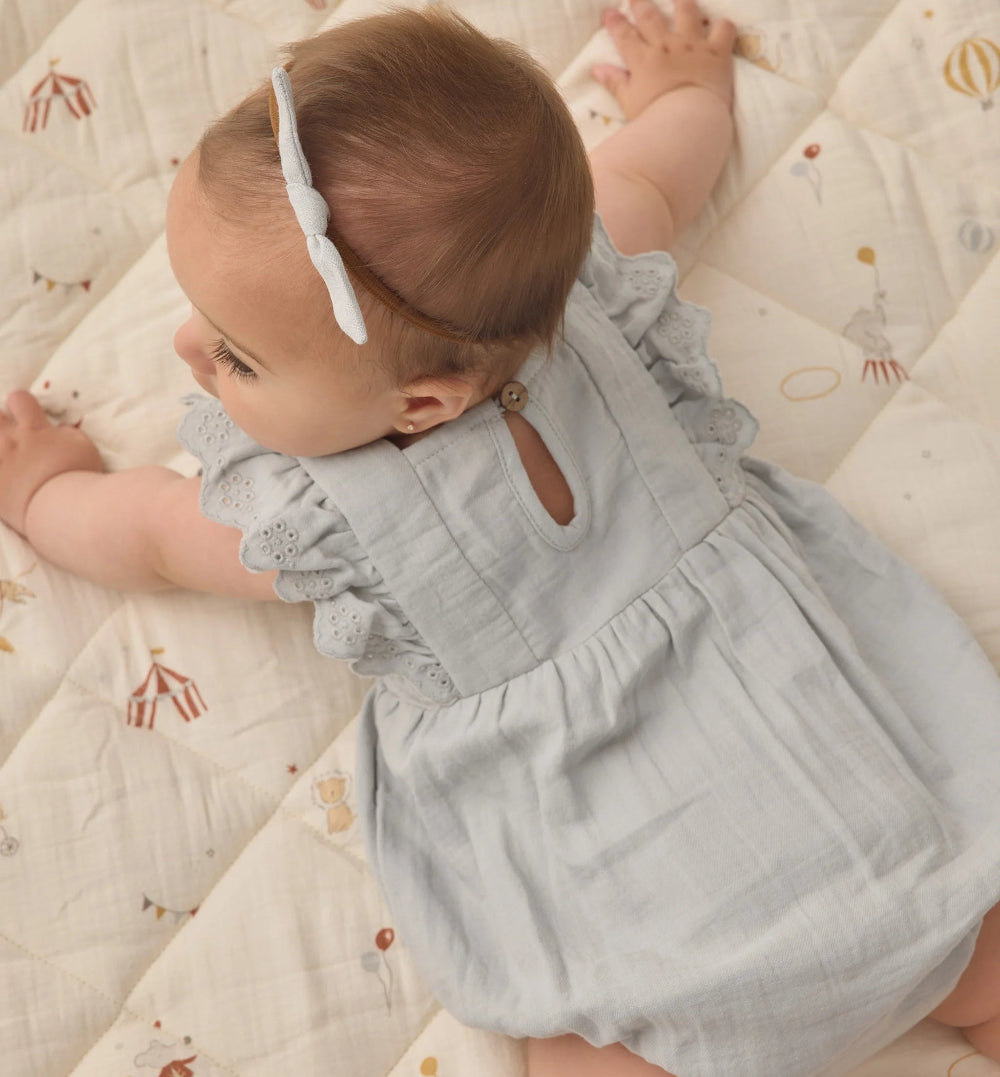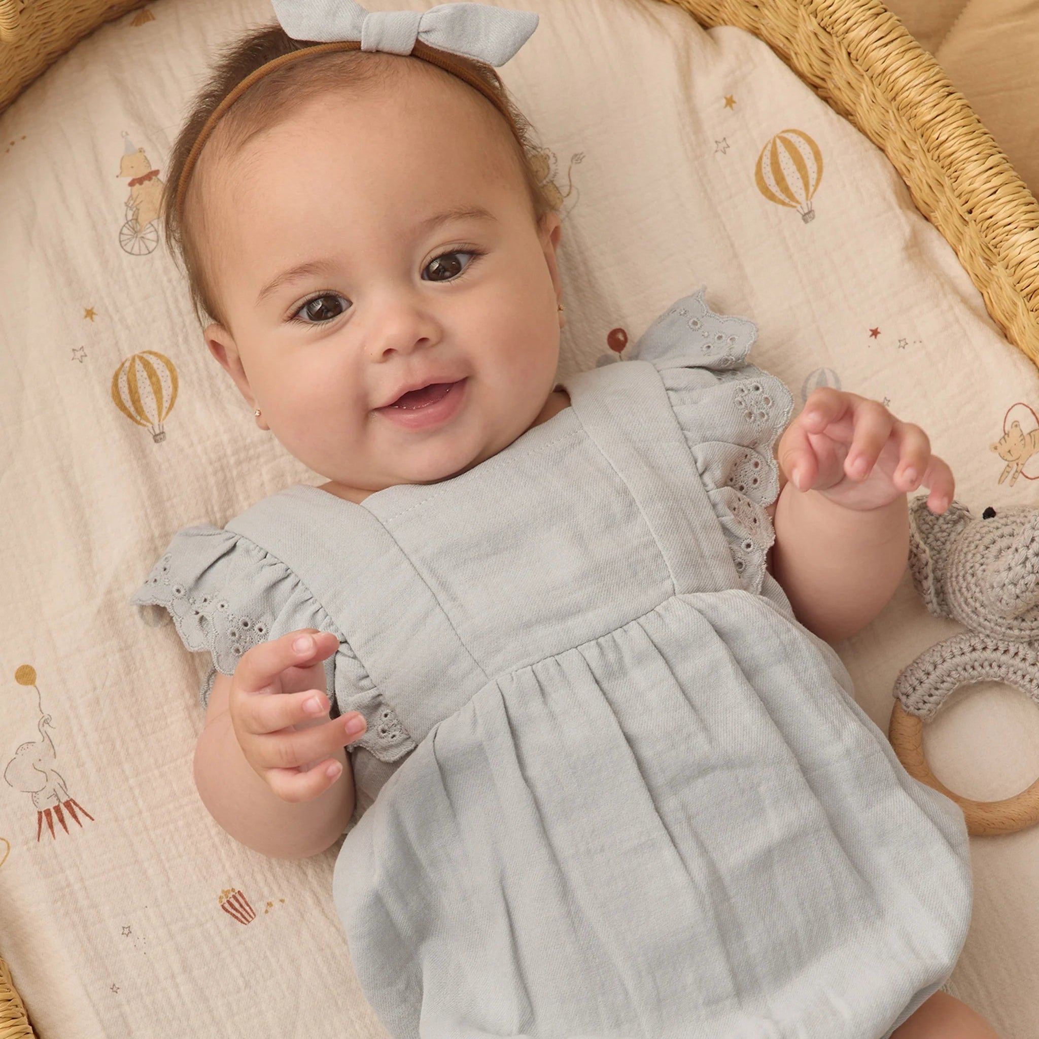 Ruffle scalloped sleeves with embroidered detail make the Naomi Romper a fancy fun look for spring. Designed with a keyhole back with button enclosure and bottom snaps for easy changing.