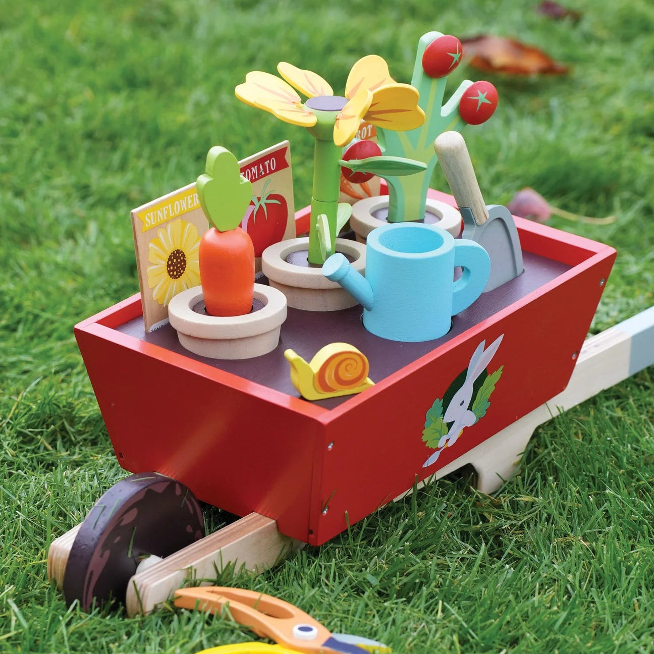 For all the budding gardeners out there…a sturdy solid wood wheelbarrow complete with 3 seed packets, 3 flower pots with a sunflower, carrot and tomato plant. Water the plants with a watering can, tend with a trowel and cut the flower with the birdy secateurs.