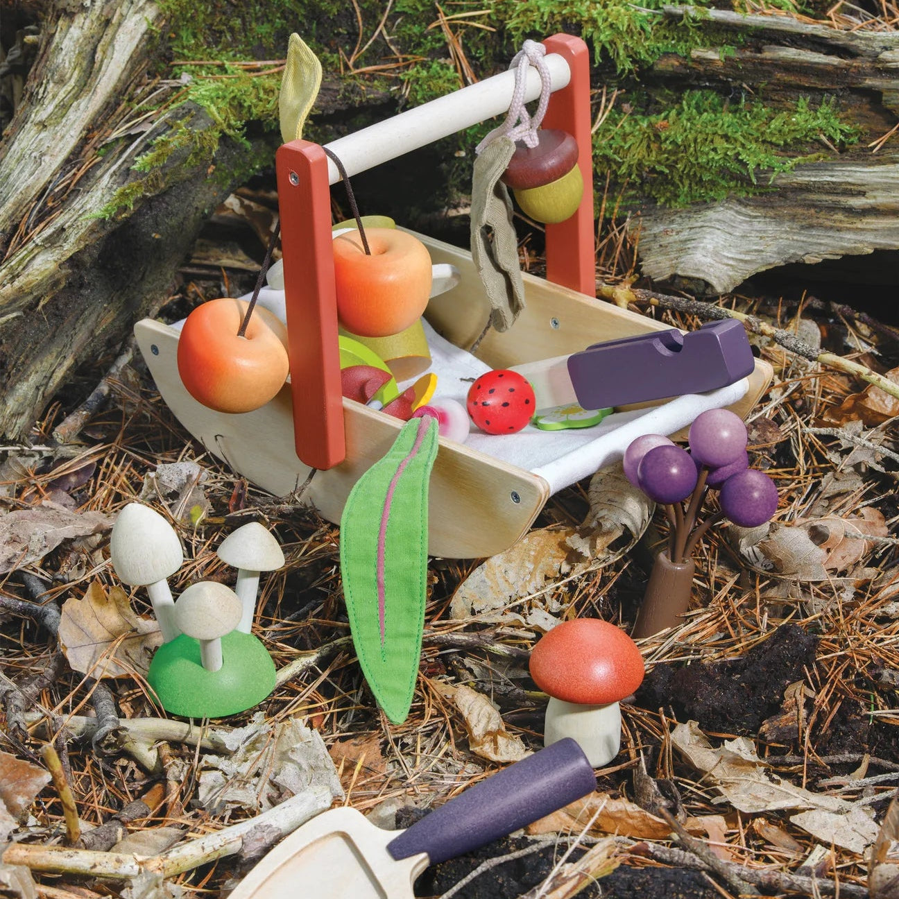 A fabric and wood trug brimming over with foraged plants, mushrooms, flowers and berries. Included is a fold away pocket knife for cutting branches and a trowel for searching for mushrooms. The set includes popular and edible treasures that can be foraged all through the year in forests and hedgerows. Set includes: 2 crab apples, 2 wild strawberries and 2 flowers, wild garlic and flowers, 3 small mushrooms and a cep, sloe berries, dandelion leaf and flower, 3 part tree fungi on a trunk, sweet chestnut and an acorn with leaves. Includes a fold out recipe leaflet with 8 recipes that correspond to the contents of the trug. Good for pretend play. Good for social and language skills.