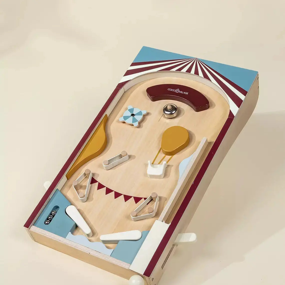 Flip, Spin & Ring! Step right up for a classic twist on arcade fun! This beautifully crafted wooden pinball machine brings the excitement of the circus to your home. Designed with a colorful chapiteau-style frame, it invites young players to enjoy the challenge and joy of traditional pinball play — hands-on and screen-free.