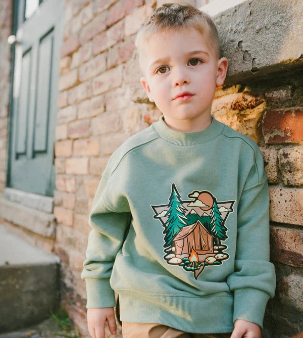 Playful and comfy, this French terry sweatshirt in pale green brings a fun twist to casual days. It features a colorful graphic lmountain camping print on the chest, ready for hiking adventures. Finished with long sleeves, a crew neckline, and ribbed cuffs and hem.