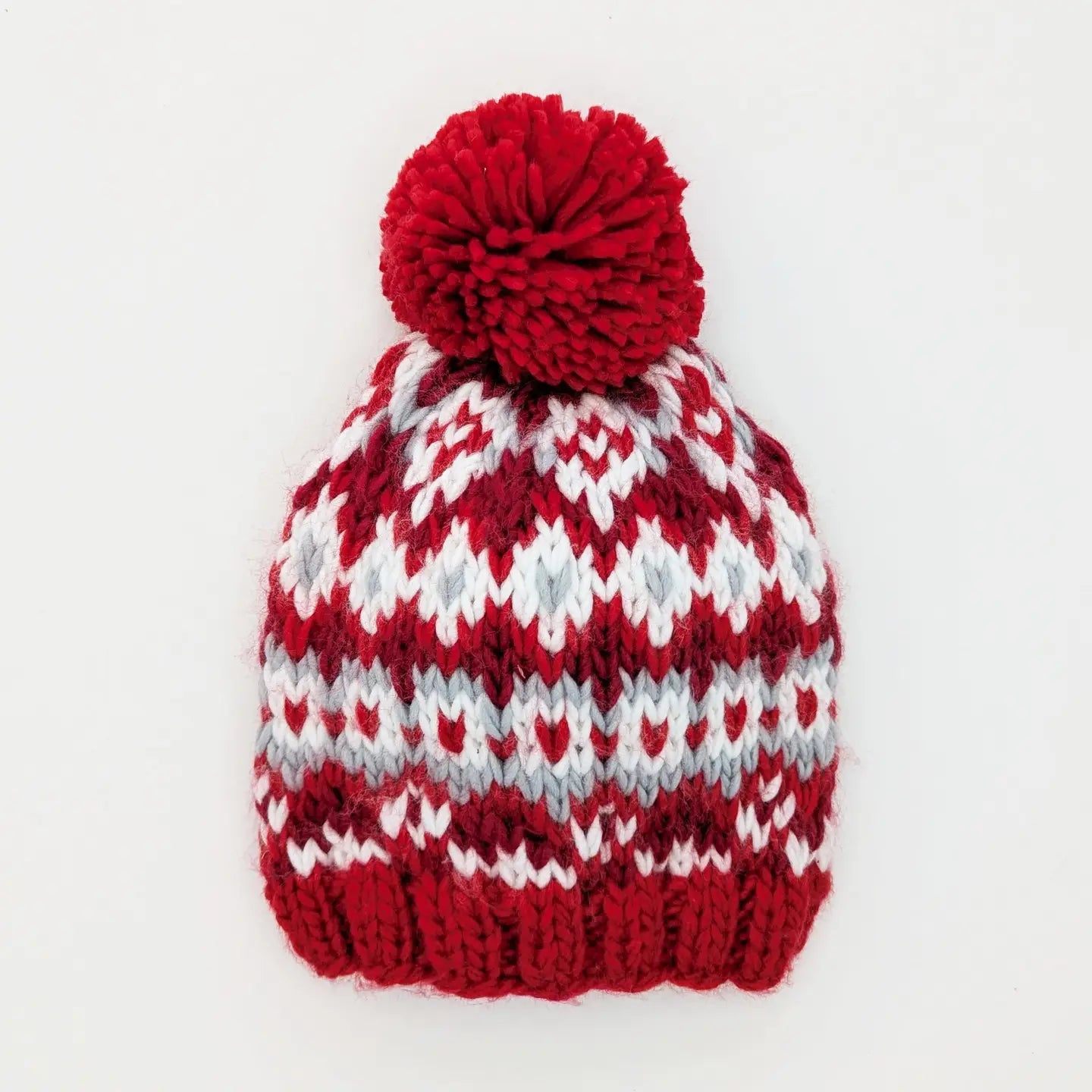 Get ready for some serious cuteness. This Nordic inspired beanie hat is hand-crafted with soft, chunky yarn in a playful pattern of Reds, White and Grey. Of course, we couldn't resist adding a Red pom pom on top for extra fun! Want to make it a complete look? Check out our coordinating sweater!