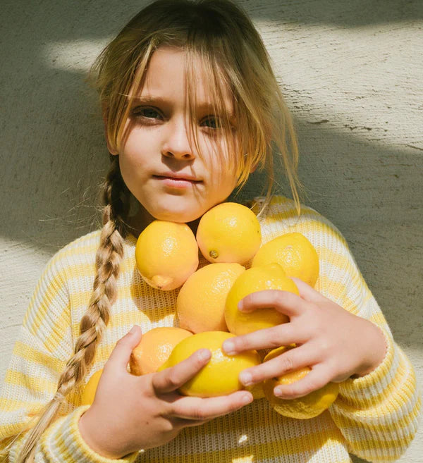 Fresh and modern, our striped sweater yellow and white is a versatile layer with a trendy cropped length. This pullover features a ribbed texture, a classic crew neckline, dropped shoulders, and buttons at the shoulder for easy dressing.