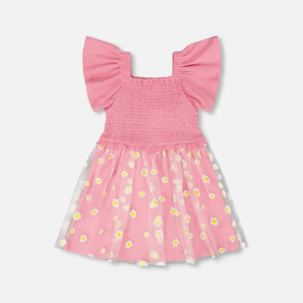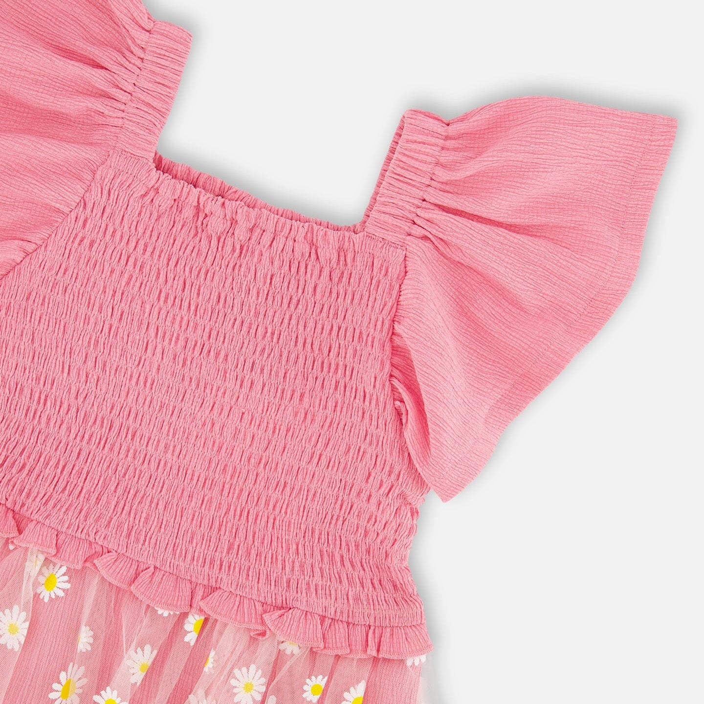 Delicate and breezy, our mesh and crinkle jersey dress with smocking in pink is made for sunny days. This sleeveless dress features stretchy smocking at the bodice, playful flutter straps, and a flared skirt with an allover daisy print.
