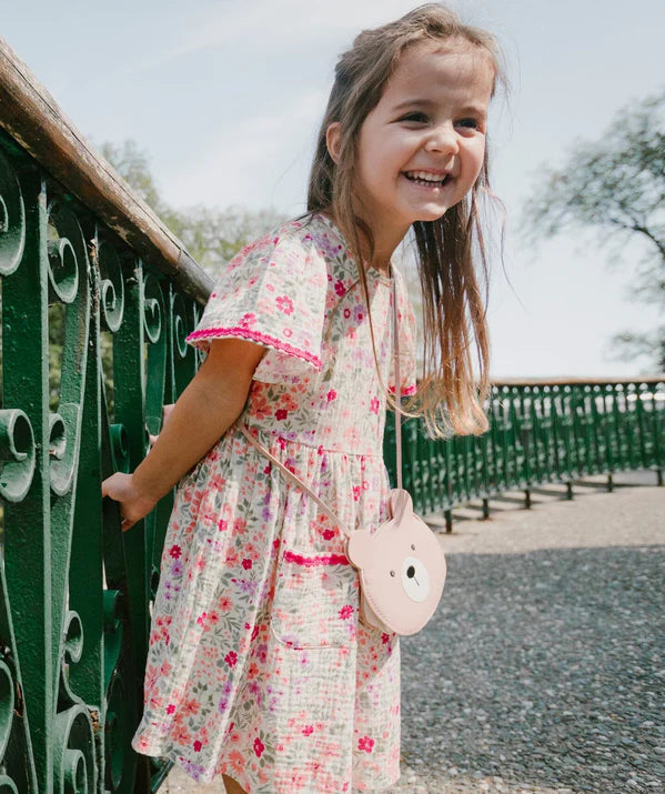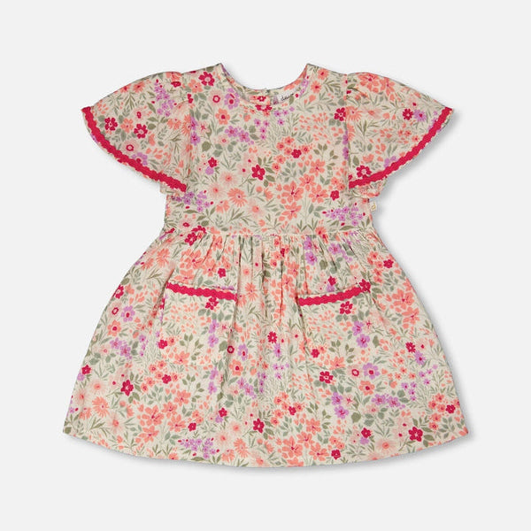 The muslin dress off white with printed flowers is a charming piece for young girls. This floral dress features flutter sleeves, a gathered waist, two front patch pockets, and a flared skirt that twirls beautifully with every step. Made from soft cotton muslin, it ensures breathability and comfort for warm summer days.