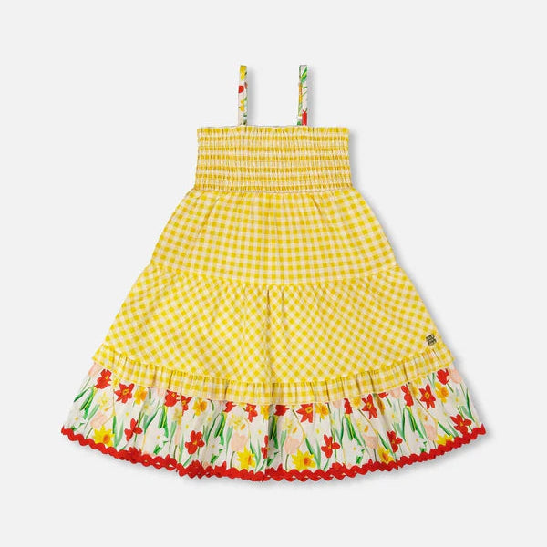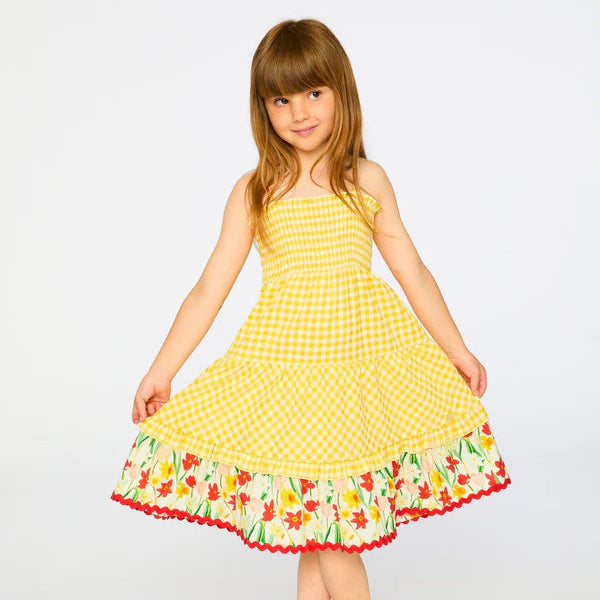 Bright and playful, our sundress in yellow gingham is made for sunny days and carefree adventures. This sleeveless dress combines smocked details on the bodice with a flowing skirt that transitions into a lively daffodil print. Lightweight cotton blend fabrics ensure comfort and ease, making it a favorite for every summer outing.