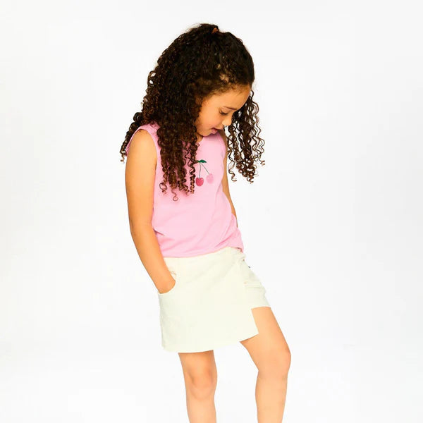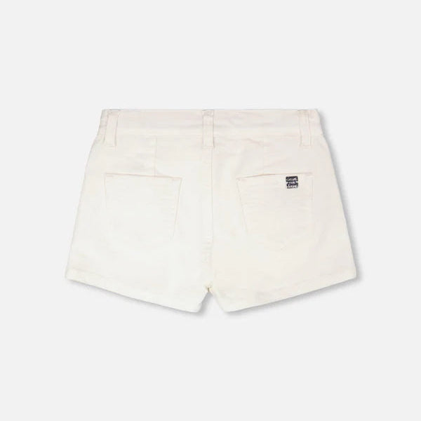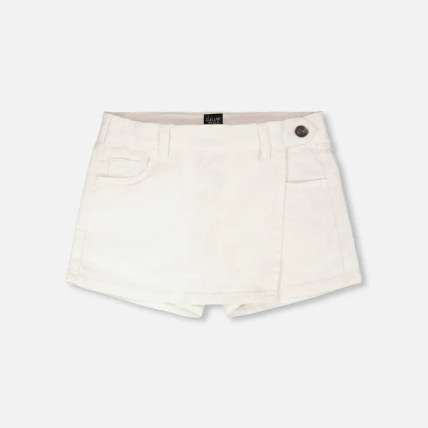 The stretch twill skort in white blends playful style with everyday practicality. This skirt-short design features real front pockets, belt loops, and a side button that adds a smart finish to its clean silhouette. Made from soft stretch twill cotton, it offers both comfort and ease for every girl’s springtime adventures.