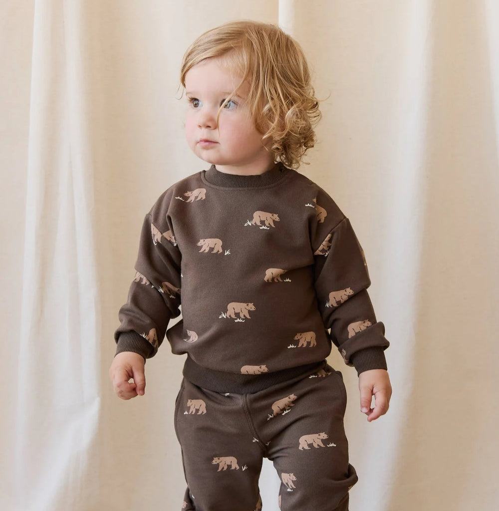 A playful and cozy essential, the Peyton Sweatshirt in Bear Buddies Canteen features a warm brown base with an all-over print of adorable beige bears walking. With ribbed cuffs, hem, and neckline, this sweatshirt offers a snug and comfortable fit—perfect for layering on cooler days.