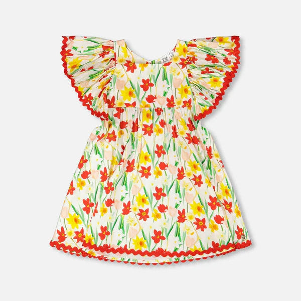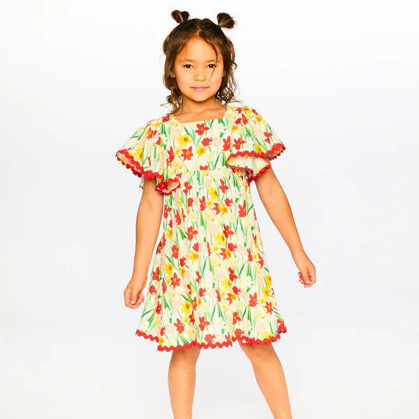 Fresh and whimsical, our viscose dress white with daffodil print is designed to brighten her sunny days. This floral dress features a soft cotton-viscose blend with a square neckline, puff sleeves and scalloped edges, adding charm to its breezy silhouette. Part of our “Under The Daffodils” collection, it’s a perfect choice for twirling through warm afternoons.