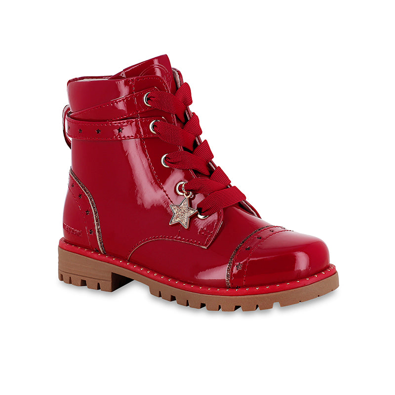 Ankle boots for girls essential in any winter closet. A practical and warm shoe for the coldest days. Patent leather effect outer material. Shoes with inner lining and breathable cotton insole. Lightweight and flexible rubber sole. Adjustable velcro strap which guarantees a perfect fit. Shoelaces to fasten for a tighter fit around the foot.