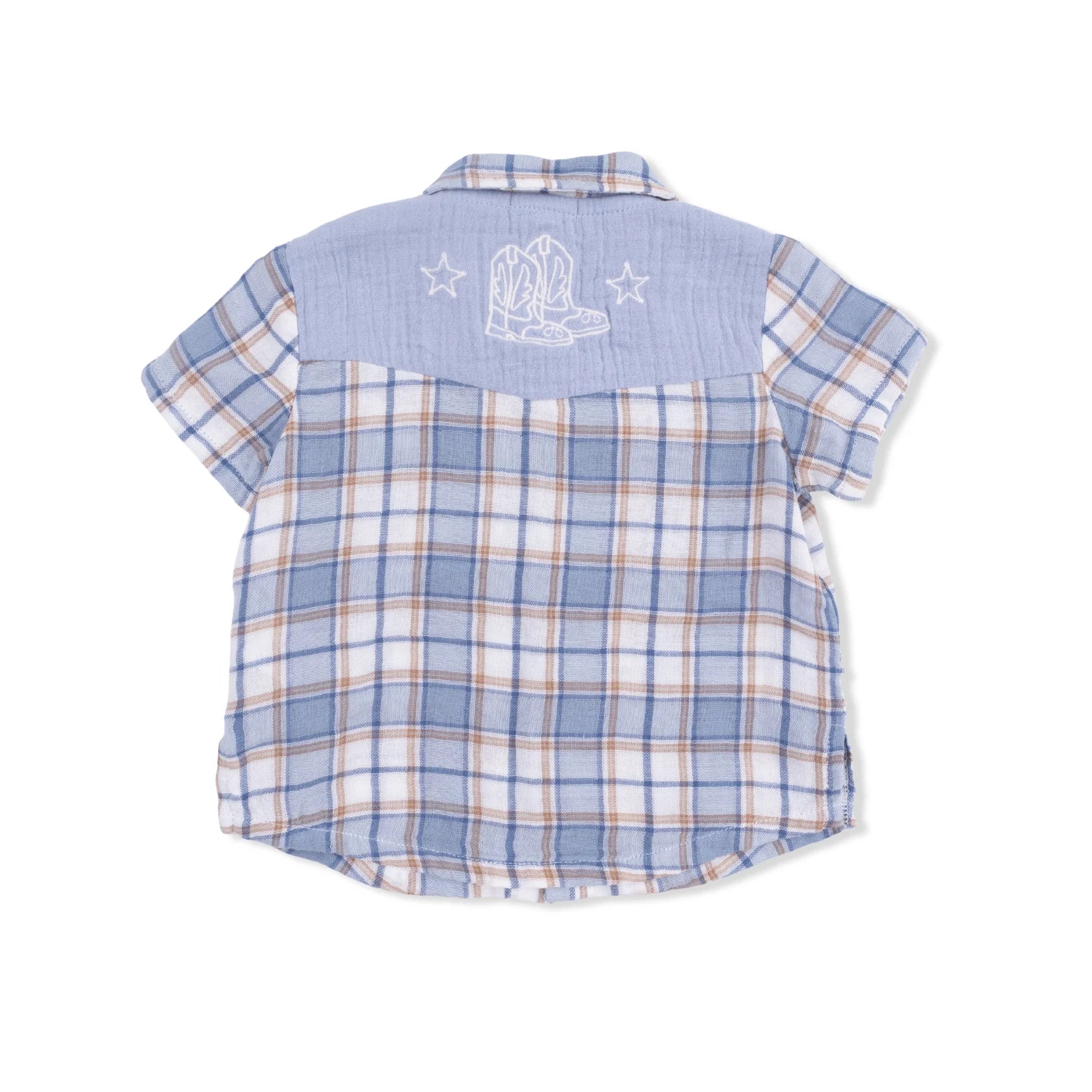 Bring a touch of western charm to playtime with our Short Sleeve Western Pearl Snap Shirt and Casual Shorts, made from soft, breathable Organic Cotton Muslin. The shirt features classic pearl snaps and adorable cowboy boot embroidery on the front and back, while the matching shorts have a drawstring waist and two handy pockets for comfort and convenience. Perfect for adventures, playdates, or everyday fun.